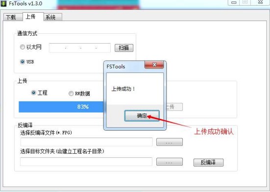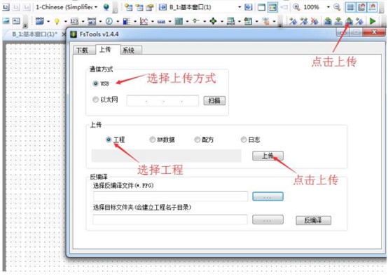 2. 軟件點(diǎn)擊”上傳“,設(shè)置通訊方式,選擇上傳工程,點(diǎn)擊上傳按鈕