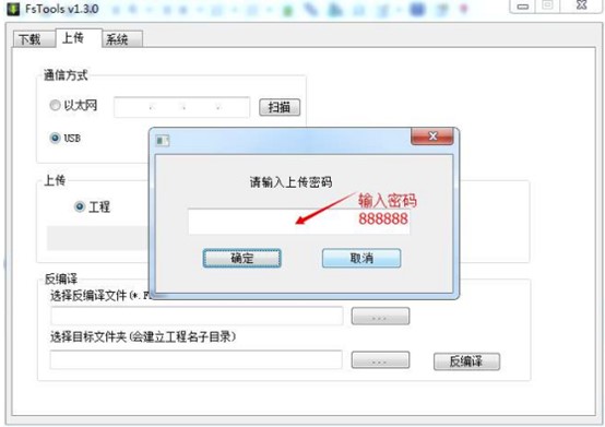 2、輸入正確的上傳密碼,默認(rèn)為”888888“,如果默認(rèn)上傳密碼被修改會提示密碼錯誤,或者提示禁止上傳就需要專業(yè)人員進(jìn)行解密了,有需要可以聯(lián)系我們(百度一下速捷工控)