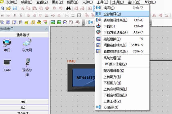 1. 觸摸屏接通電源,軟件內(nèi)工具菜單點擊“全部編譯”,等待編譯完成